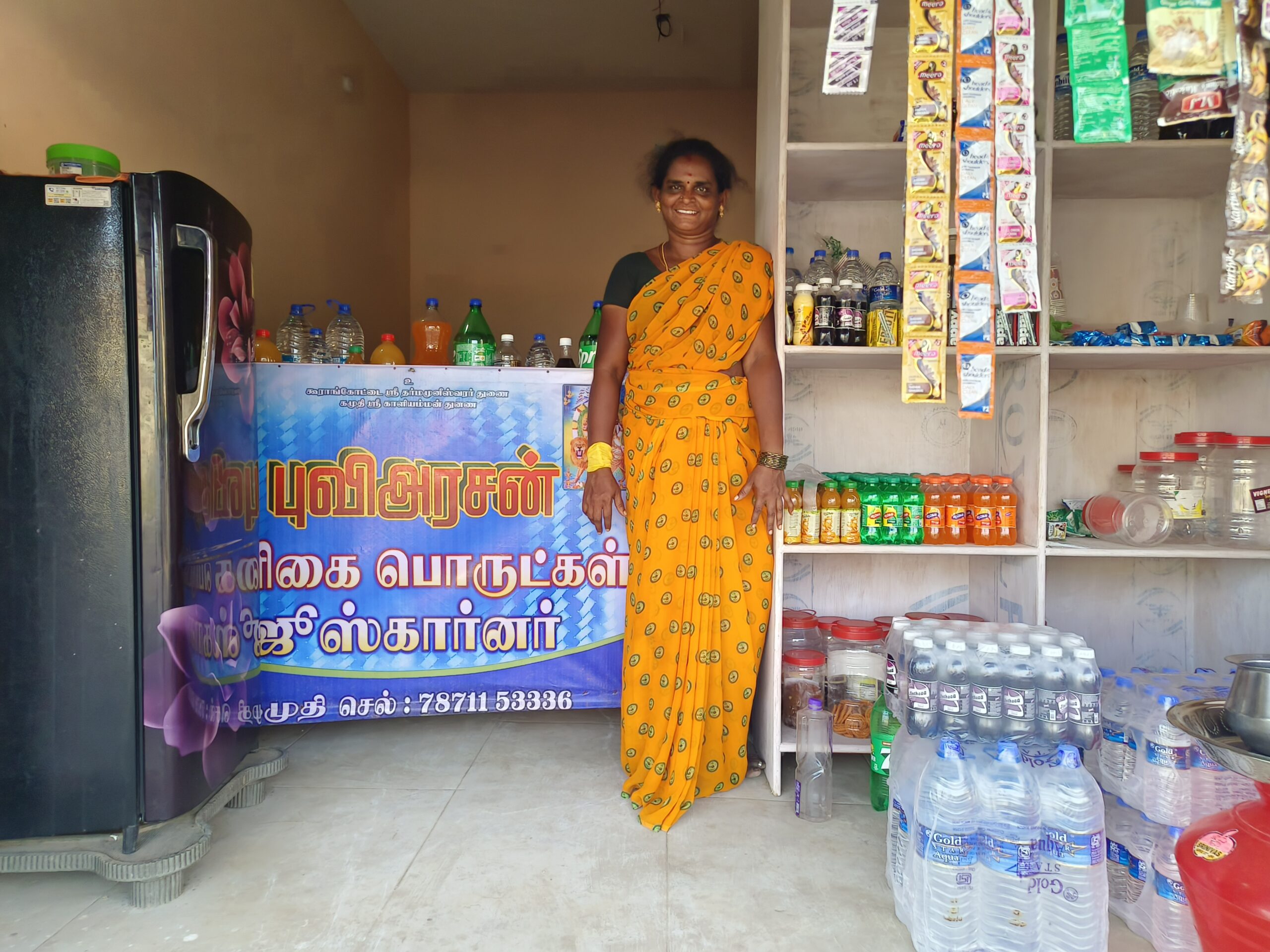 With time and effort, she expanded her business, rented a shop, and hired another woman to help. She saved enough to start a juice and grocery store. Now, she earns around Rs.10,500 ($116.30 USD) per week and continues to attend training sessions through the Jeyam Society, a RSWR partner. Kavitha’s story is one of resilience and determination. Through hard work and support, she created a stable life for her children and regained control of her future.